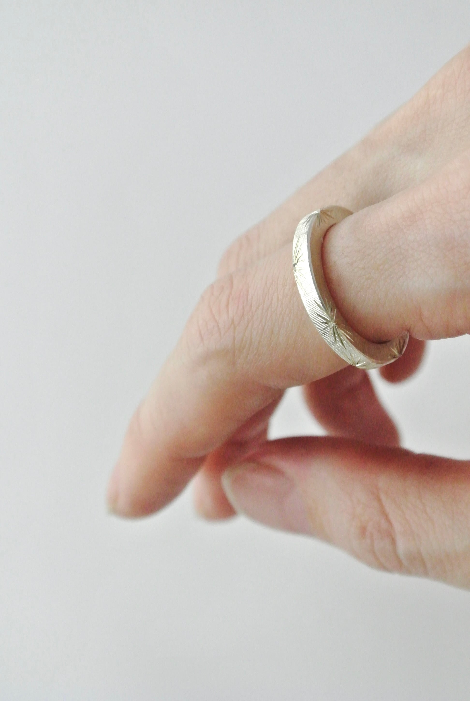 Rings with INCISIONE. INCISIONE is "Western carving" on Italian Florentine style jewelry. In this technique, lines thinner than a human hair are carved by freehand on the metal. The light gives the ring a silky sheen. MEMENTO PATTERN uses this traditional technique to develop new expressions.